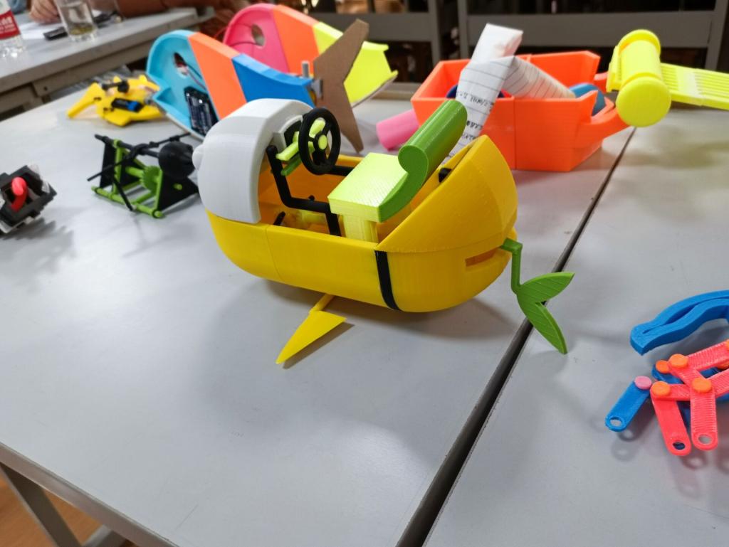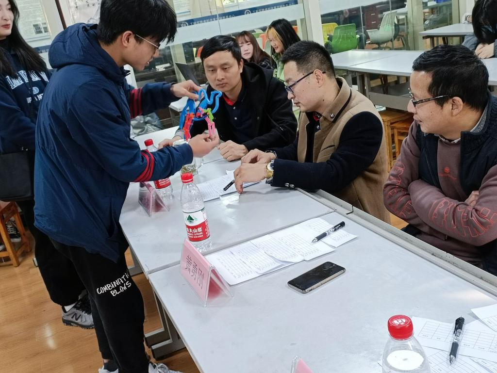 接下来由各参赛小组携带小组作品依次上台,小组代表对自己小组作品的设计背景、产品功能、打印制作环节进行演讲并对作品进行讲解展示。介绍完毕后,小组代表将作品带到评委老师面前由评委老师进行评价打分,且各位评委老师提出相应的指导建议。