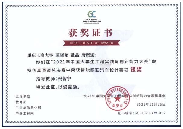 本届赛事,重庆工商大学师生参加了智能网联汽车设计分项赛、工程基础赛道、“智能+”赛道和企业运营仿真分项赛。在重庆市教委组织的省赛阶段,122cc太阳集成游戏师生在智能网联汽车设计分项赛获得了特等奖2项、一等奖2项、二等奖2项、三等奖4项的优异成绩。其中,智云队(18级智能制造班谭晓龙、18级机械设计及其自动化班戴品、17级汽车服务工程班唐煜斌,指导教师:杨智宇)获得省赛第一名,作为重庆市智能网联汽车设计分项赛唯一代表参加国赛。