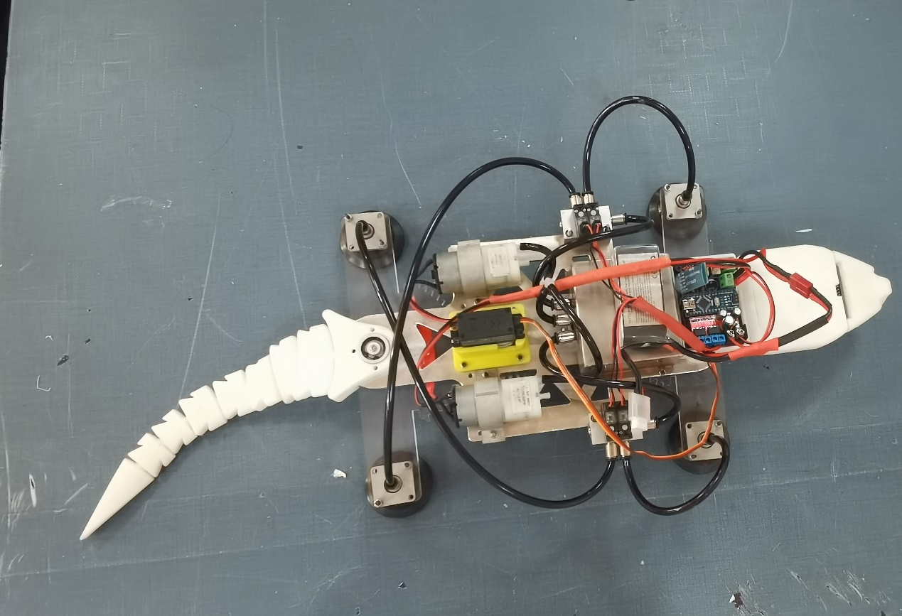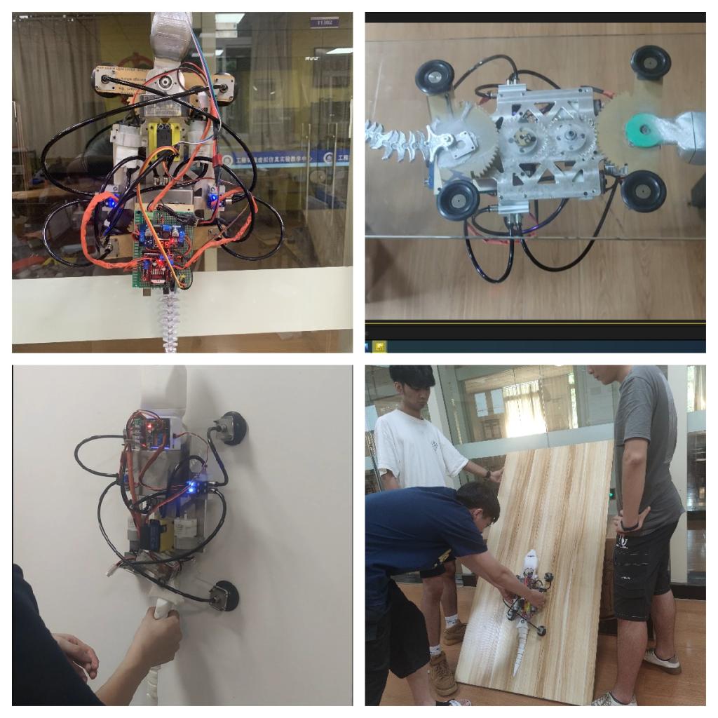 “雄心迈步象牙塔,棋逢对手敢亮剑”。122cc太阳集成游戏参赛作品—仿生壁虎机器人团队的同学们,通过观测与研究壁虎的步态与爬行特点,灵活应用齿轮连杆传动机构创新地设计了单源控制,四足协控的机器壁虎,为了便于吸附墙壁进行爬行,设计了包含微型真空泵、微型电磁阀、真空保护阀、真空储备罐、真空吸盘等部件的真空吸附系统,确保壁虎可以在玻璃或垂直墙壁安全、稳固的爬行。此外,团队的同学们还对仿生壁虎机器人进行了电控系统设计。一方面,利用模块化的概念,对主控板进行了PCB制版设计与加工,强化了其功能模块的快换与扩展功能,同时使电控模块具备了体积小,易安装,高可靠等特点,另一方面,应用C语言对吸附系统、机械传动系统、智慧功能模块进行编程,使得该机器人系统能够安全、稳定地完成垂直墙面爬行(玻璃墙体、建筑外墙、室内墙体等)、转弯、避障,陡坡爬行与避障、远程控制等多种功能,可用于民用外侧高墙及玻璃墙体的清洁,以及桥隧高壁的结构检测等任务。